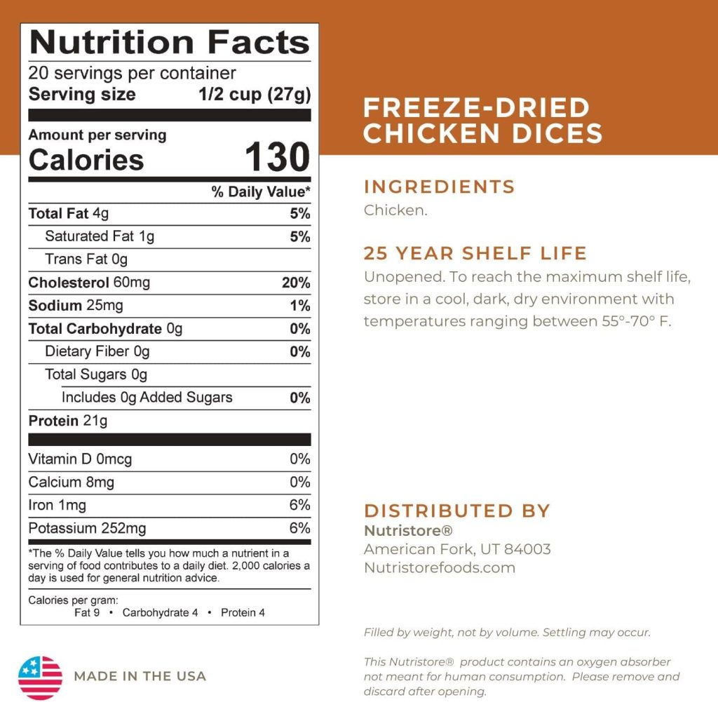 Nutristore Freeze-Dried Chicken contains only one ingredient: chicken. It is never dehydrated or filled with artificial preservatives or unhealthy additives. The freeze-drying process locks in the nutrition, ensuring you receive the highest quality meat in every bite. Produced and canned in the USA, you can trust Nutristore for its commitment to quality and purity.