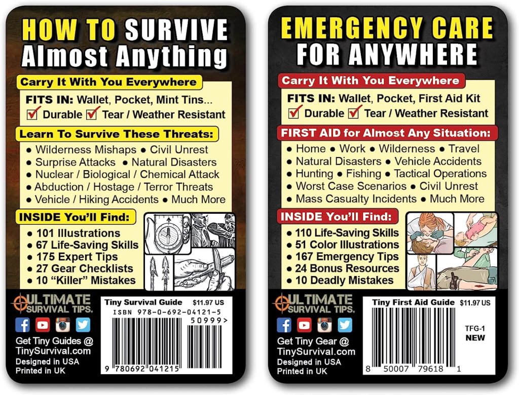 Designed to be the size of a credit card, these guides are easy to carry in your wallet, making them accessible whenever you need them. Despite their small size, they pack in a wealth of information, including 167 emergency tips, 152 step-by-step illustrations, 177 life-saving skills, and 107 survival and first aid hacks.